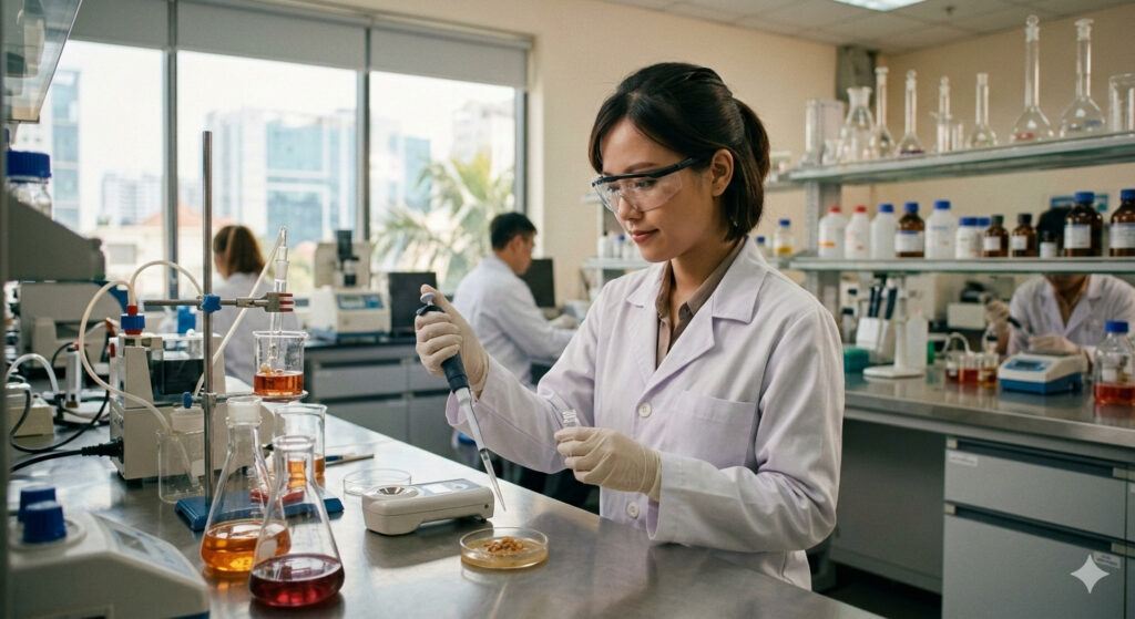 Phòng nghiên cứu và phát triển sản phẩm (R&D) là nơi các doanh nghiệp thực phẩm lớn — từ Vinamilk, Masan đến các tập đoàn nước ngoài như Nestlé, Ajinomoto — đặt ra yêu cầu tối thiểu thạc sĩ hoặc tương đương cho vị trí cấp cao. Nhiệm vụ bao gồm phát triển công thức sản phẩm mới, tối ưu quy trình chế biến, kiểm soát hương vị và dinh dưỡng. Đây là vị trí đòi hỏi nền tảng lý thuyết sâu mà chỉ đào tạo đại học thường chưa đủ.